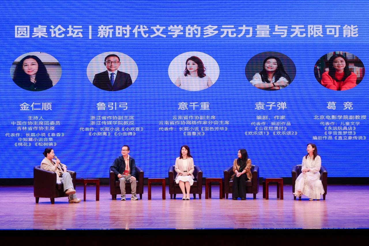 开幕式后举行了圆桌论坛对话活动,金仁顺主持论坛。上半场论坛以“新时代文学的多元力量与无限可能”为主题,鲁引弓、意千重、袁子弹、葛竞围绕主题展开对谈。大家谈到,文学创作的可能性建立在深入生活、深入史料的基础上,只有下大力气去了解书写对象的来龙去脉,才有可能将作品写得真实动人。面对短剧的冲击,今天的影视行业创作者应当坚守自身的特色与审美,儿童题材作品更需要进一步加强想象力和创造力,深挖中华优秀传统文化,找到传统文化与现实生活相结合的有效路径。
