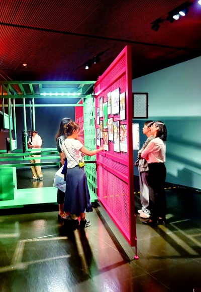 香港单元的主题为“香港快拍·城市漫步”,呈现了四组由香港青年艺术家们创作的具有非遗元素的视觉艺术作品。四组作品灵感分别源自广州彩瓷技艺、香港长衫、传统活版印刷和香港街头的盒子形摊子。“看到这些霓虹灯和港式盒仔档,就像来到了香港中环街市。”现场观众田女士触景生情。